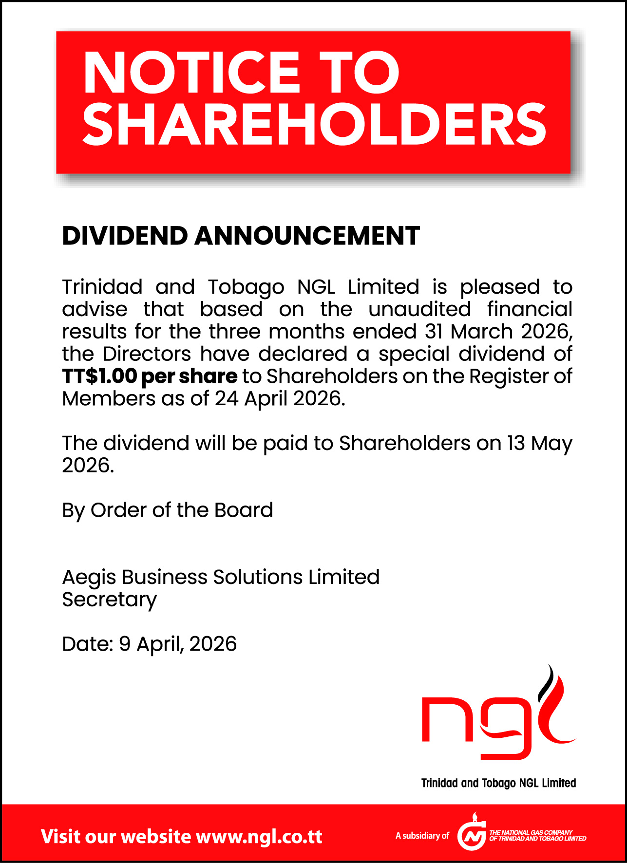 Trinidad and Tobago NGL Limited is pleased to advise that based on the unaudited financial results for the three months ended 31 March 2026, the Directors have declared a special interim dividend of TT$1.00 per share to Shareholders on the Register of Members as of 24 April 2026.