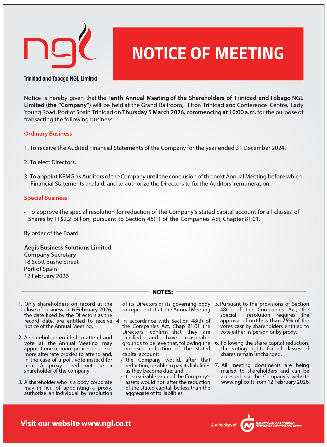 - All meeting documents are being mailed to shareholders and can be accessed via the Company’s website ngl.co.tt/agm-docs from 12 February 2026.